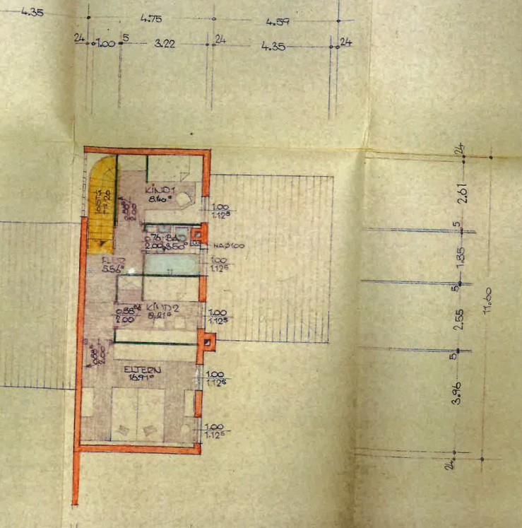 Im Obergeschoss sind das Schlafzimmer und 2 Kinderzimmer sowie das Bad.